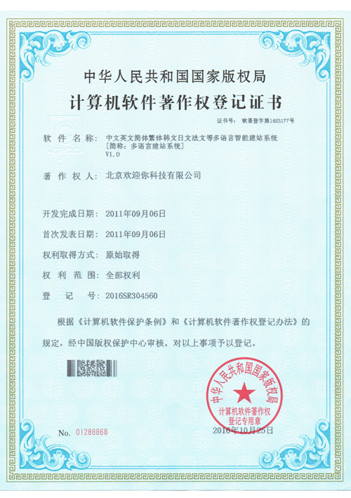 北京歡迎你科技有限公司獲得多項國家版權局頒發的"計算機軟件著作權登記證書",并已獲得“全國質量服務客戶滿意誠信企業”、“全國重合同守信用品牌企業”和“全國誠信經營示范單位”等榮譽稱號。